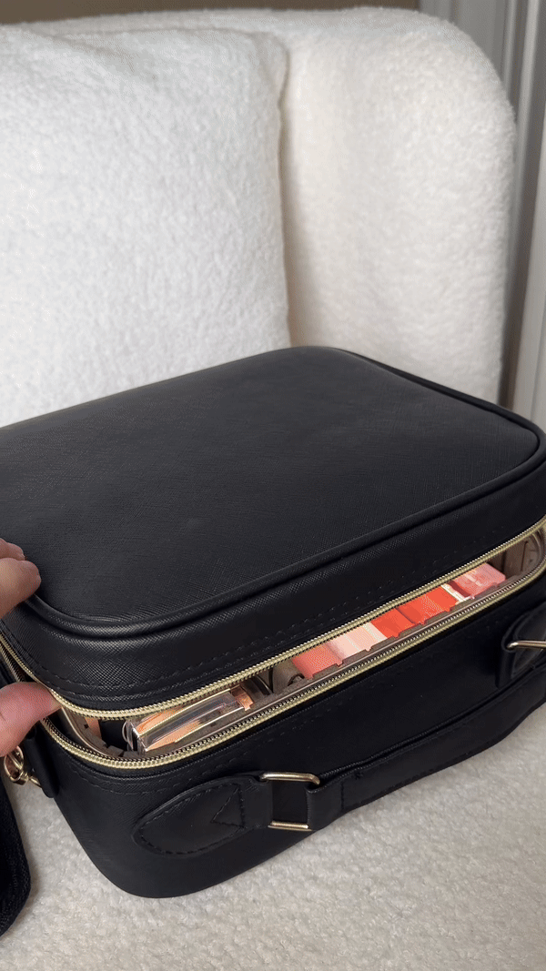 A luxury makeup case made for travel, with a built-in mirror, adjustable lighting, and secure compartments to keep your essentials ready anywhere you go